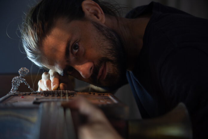 A partir de instrumentos musicais descartados, o acervo conta com 20 esculturas inéditas. Com a técnica de montagem, o artista uniu conhecimentos de luthieria e engenharia mecânica para criar instrumentos que, além de encantar visualmente, também geram sons complexos e únicos. “São instrumentos musicais elétricos feitos de cordas que eu inventei e construí utilizando materiais retirados do lixo, instrumentos quebrados e antiguidades. É um trabalho que atravessa a minha vida toda”, explica Rafael.