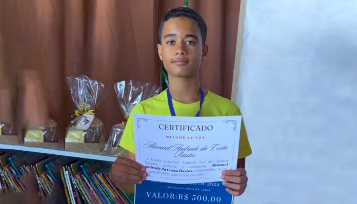 O estudante Abimael Andrade da Costa Bastos, 14 anos, do 8º ano do ensino fundamental, da Escola Estadual Professora Augusta Vaz dos Santos Teixeira, localizada na cidade de Combinado, alcançou um conquista importante em 2024. Ele foi o aluno que leu mais livros, durante o ano letivo. Foram 325 obras lidas, e, com isso, ele ganhou o prêmio no valor de R$ 500,00. O incentivo à leitura e à produção de textos são ações que estão no Programa de Fortalecimento da Educação (PROFE), desenvolvido pelo Governo do Tocantins, por meio da Secretaria de Estado da Educação (Seduc).