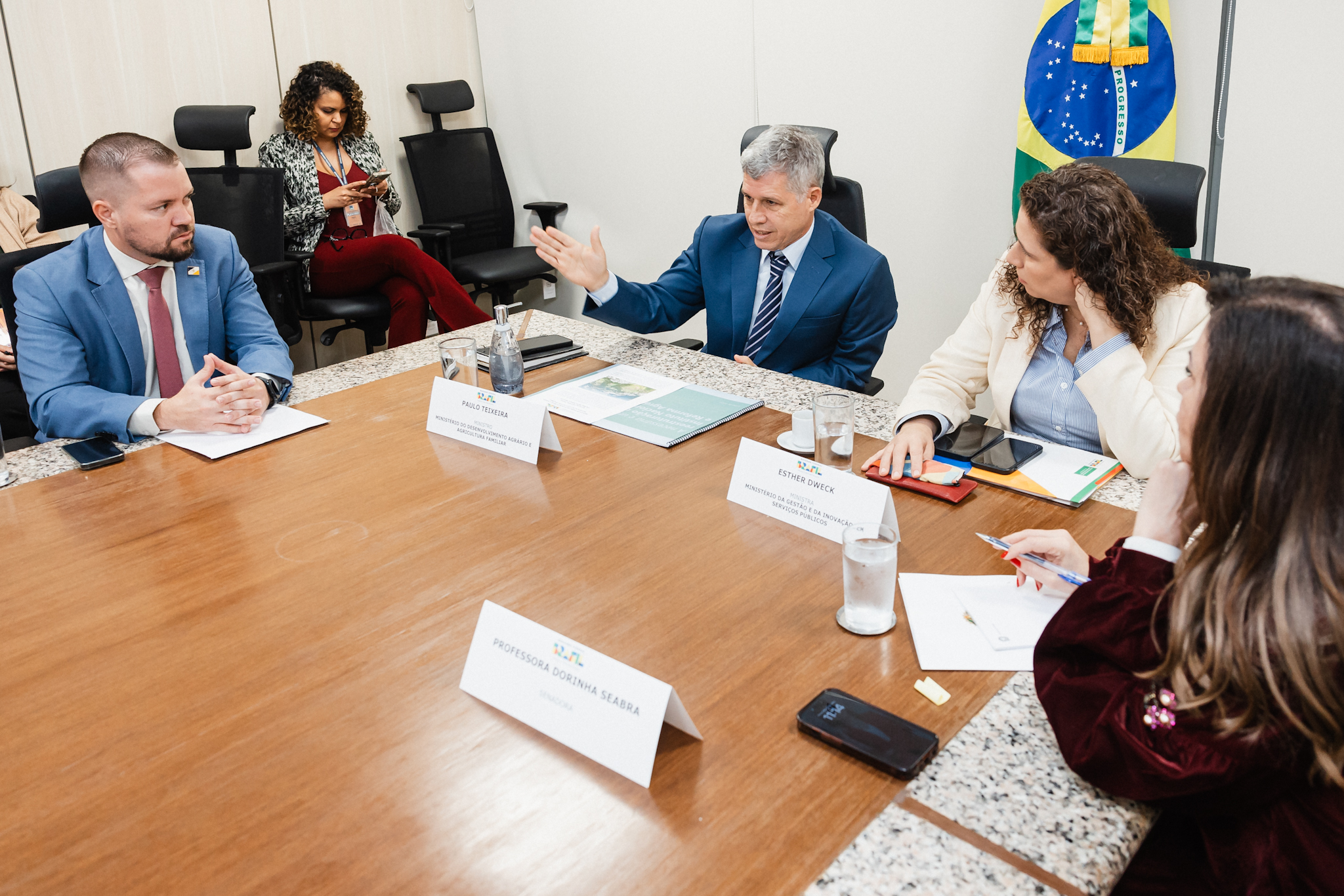 A reunião ocorreu entre o ministro do Desenvolvimento Agrário, Paulo Teixeira; a ministra da Gestão e da Inovação, Esther Dweck; o presidente do Incra, César Aldrighi; o presidente do Instituto de Terras do Tocantins (Itertins), Robson Figueiredo; e a senadora Professora Dorinha.