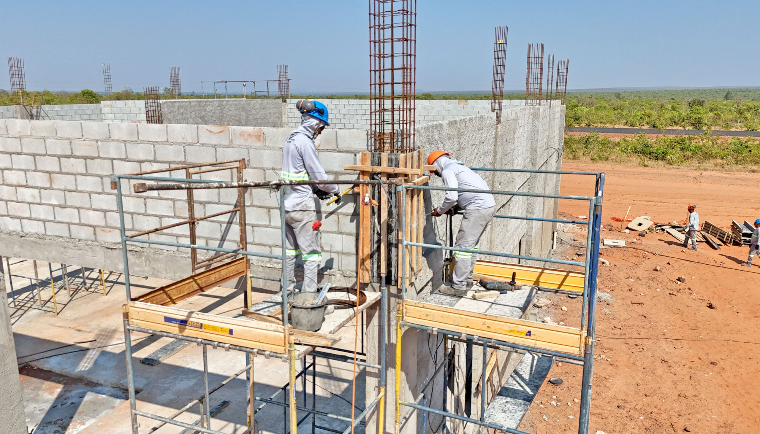 A obra iniciou em fevereiro deste ano e já foram realizados os serviços de nivelamento do terreno; preparação do solo e das camadas da pista, além das demais áreas que receberão pavimentação; construção da base do hangar – espaço destinado ao abrigo de aeronaves –, e a instalação do Sistema de Proteção contra Descargas Atmosféricas (SPDA); também foram feitas as fundações do terminal de passageiros, pilares, vigas, paredes, parte das instalações hidráulicas e parte das instalações sanitárias.