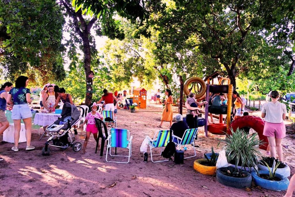 A mobilização comunitária também ganhou força com iniciativas lideradas pela farmacêutica Romara Perdigão que, ao mudar para a quadra, organizou mutirões para limpar uma área verde degradada e construir um parquinho comunitário. O espaço, mantido diariamente pelas famílias, conta com rastelos e utensílios de limpeza disponíveis para que os próprios moradores realizem a manutenção após as atividades. Para Romara, o parquinho se tornou um ponto de convivência que fortalece o sentimento de pertencimento e aproxima as famílias, especialmente durante ações comunitárias.