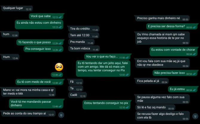 De posse do material, o sujeito passou então a submeter a vítima a terror psicológico. Através de chamadas de vídeo coercitivas, ele exigiu a prática de atos libidinosos degradantes, tais como quebrar ovos com a boca para que o conteúdo escorresse pelo corpo despido. Solicitou ainda que ela se insinuasse sexualmente para pessoas da própria família, incluindo menores de idade, e fez ameaças dizendo de que submeteria a jovem a estupros coletivos.