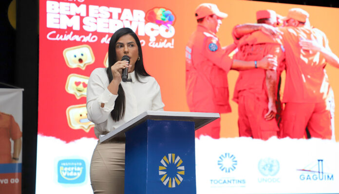 A primeira-dama e secretária extraordinária de Participações Sociais, Karynne Sotero, participou nesta segunda-feira, 29, no Colégio Militar II, em Palmas, do lançamento do Projeto Bem-Estar em Serviço – Cuidando de Quem Cuida, que tem como foco o fortalecimento socioemocional de bombeiros, servidores e alunos dos colégios militares. A ação é uma parceria do Corpo de Bombeiros Militar do Tocantins (CBMTO) e do Instituto Recriar Vidas, e tem a primeira-dama como madrinha do projeto.